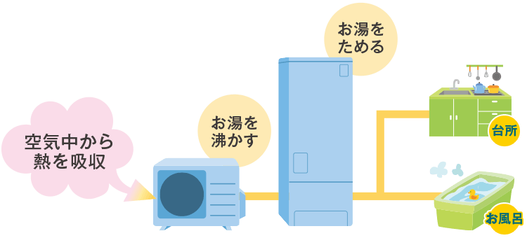 エコキュートは空気中の熱を使ってお湯をつくる給湯器です。熱効率が良くCO2の発生を抑えるエコな給湯システムで、少ない電力でたっぷりのお湯をつくることができます。